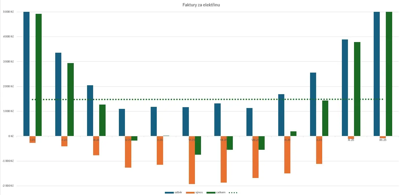 Co se týče nákladů, tak k ceně silové elektřiny a distribuce je potřeba ještě připočítat platby za jistič (3x25A) a další fixní měsíční platby. V letním období pak FVE dodává i ve větším měřítku do sítě, což generuje výnosy, které v nejsilnějších měsících pokryjí jak odběr, tak fixní platby.