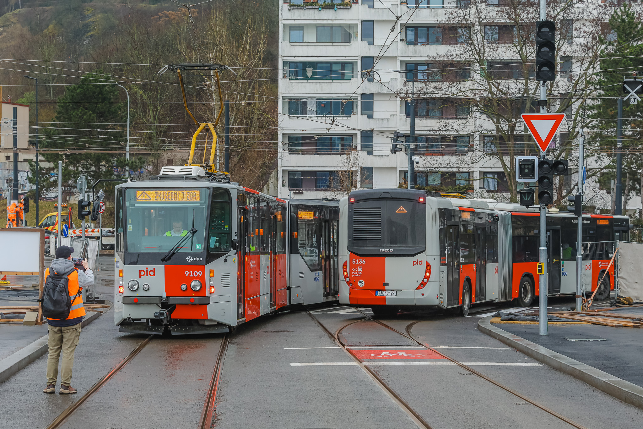 Zatímco na konci února testovala novou trať na Dvoreckém mostě měřicí tramvaj přezdívaná „pomeranč„, ve čtvrtek na ni vyrazily už i klasické kloubové tramvaje spolu s autobusy. Proběhly tak zkušební jízdy, kterými se kromě jiného ověřuje funkčnost nainstalované světelné signalizace a průjezdný profil nové tratě.