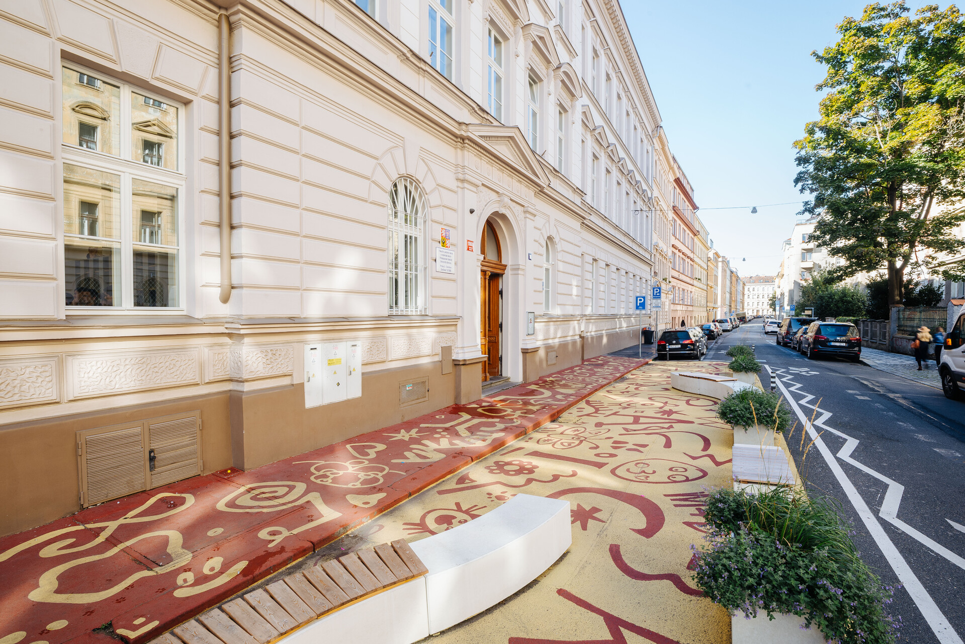 Taktický urbanismus. Zdroj: Jan MalýPřed základní školou Grafická na pražském Smíchově vznikla plocha s barevným asfalt artem. Zdroj: Jan MalýPřed základní školou Grafická na pražském Smíchově vznikla plocha s barevným asfalt artem. Zdroj: Jan Malý