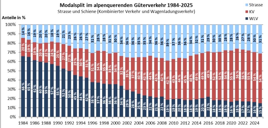 Železnice přepravila přes Alpy o 7,5 % méně nákladu než v roce 2024. Jde o nejnižší podíl železnice za posledních deset let. „Důvody pokračujícího poklesu transalpské železniční dopravy jsou nedostatečná kvalita a spolehlivost železniční nákladní dopravy podél evropských severojižních os – zejména v důsledku stavebních prací a uzavírek tratí v Německu. K tomu se přidává stále napjaté ekonomické prostředí,“ uvedl úřad ve zprávě, ve které označuje současnou situaci za „dramatický vývoj“.