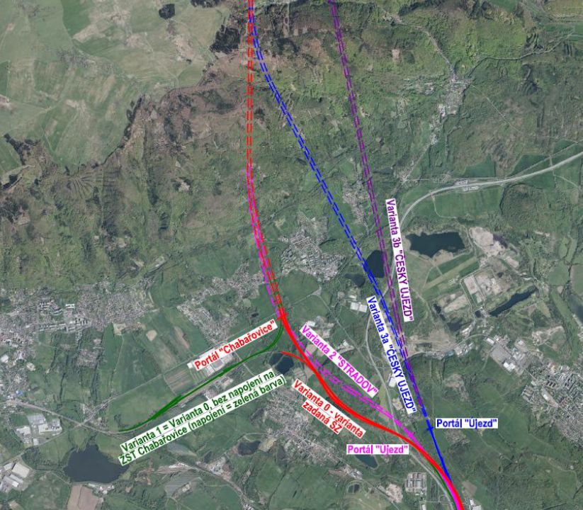 Dokumentace popisuje čtyři různé verze trasování trati před portálem Krušnohorského tunelu. Nakonec zvítězila trasa, kdy v katastru obce Český Újezd v bezprostřední blízkosti stávající železniční trati křižuje stávající dálnici D8 na nových železničních mostech. Mezi dálnicí D8 a Chabařovickými rybníky je vedená souběžně se stávající železniční tratí č. 130.