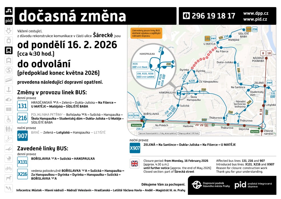 Linka 216: Odklon v trase Poliklinika Petřiny – Bořislavka – Hanspaulka – Dukla-Juliska – Sídliště Baba.