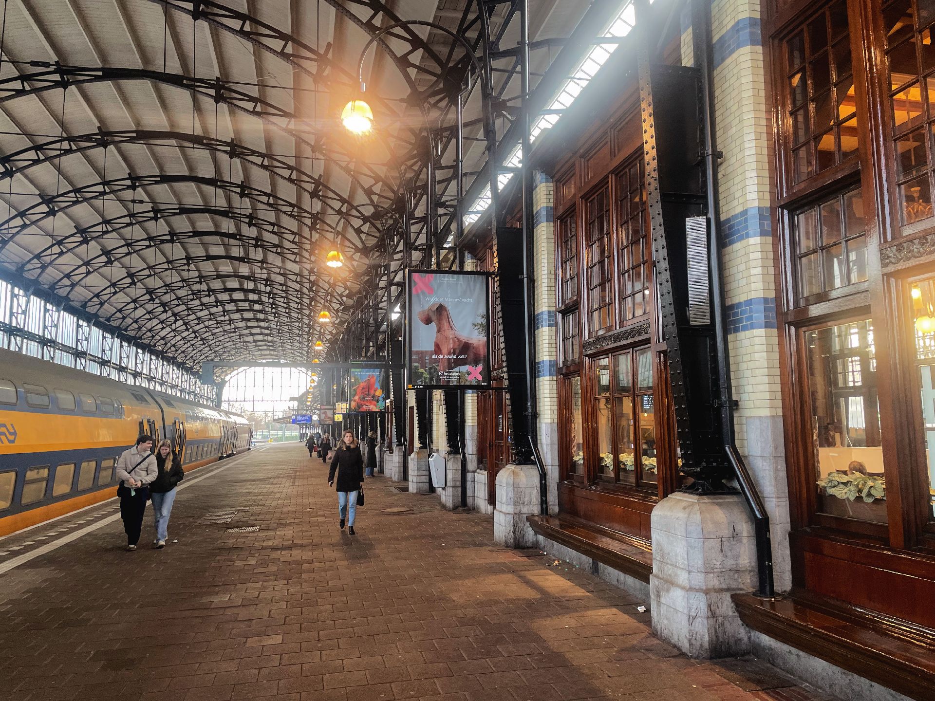 V neděli odjíždíme v 6:03 z hlavního nádraží Centraal. Je zde zvláštní mix lehce zívajících cestujících, kteří museli vstát dříve před další cestou a zejména mladších vracejících se z dlouhé sobotní noci.